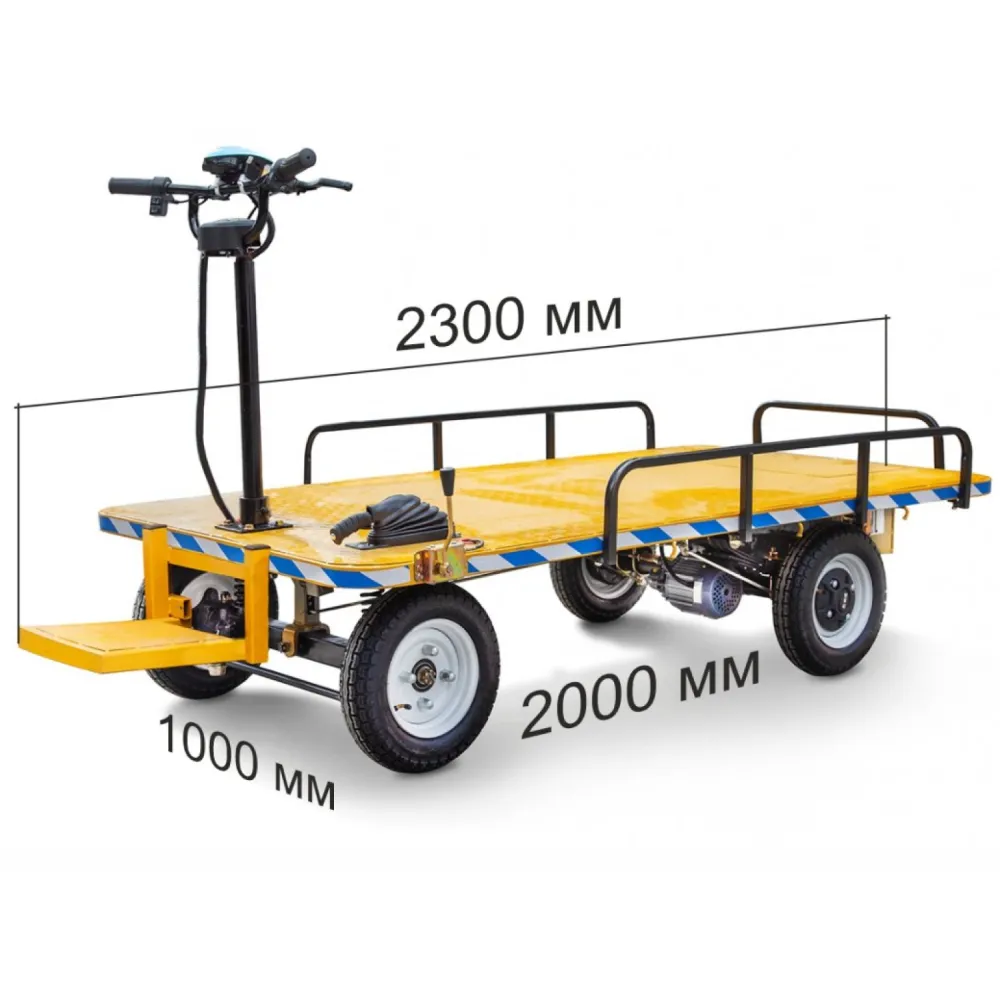 Модель изготовлена из прочной и надежной стали. Предназначена для транспортировки грузов на стройках, складских помещениях, промышленных предприятиях, зонах отдыха, аэропортах и в частном бизнесе. Мощностные параметры электромотора в 1000 Вт достаточно для развития скорости до 25 км/час и преодоления на одной подзарядке расстояния до 30 км. Платформа имеет размеры 2000 x 1000 х 400, оснащена ограничителями, исключающими случайное падения груза. Накатистые колеса способны преодолевать подъемы до 15 градусов. Пользование супертехникой можно при температурных параметрах -10С до +50С.