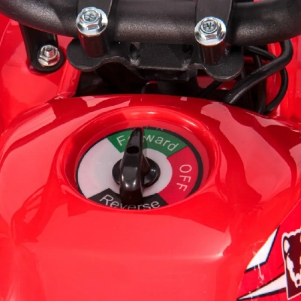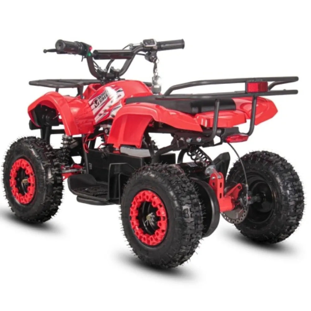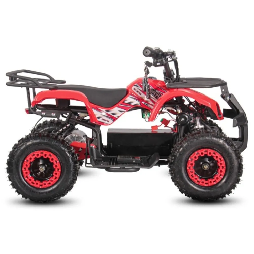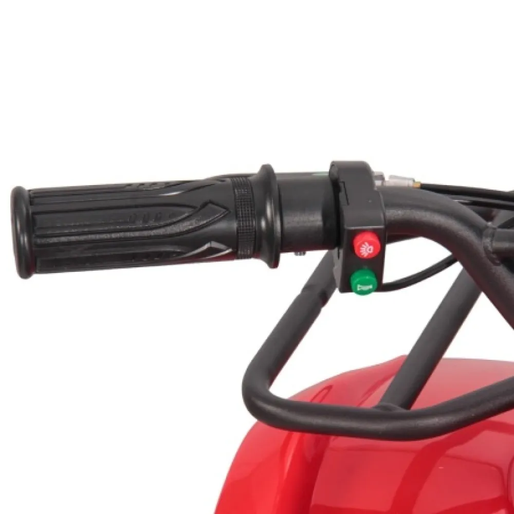 Электроквадроцикл устойчивый на ровной поверхности. Дает возможность максимального разгона, начального понимания скорости и участии в дорожном движении наравне с остальными райдерами. При мощностных параметрах электродвижка 1000 Вт максимальная скорость разгона достигает 25 км/час. Электроквадроцикл оснащен большой светодиодной фарой, разрешающей езду и развлечение подрастающего водителя в вечернее время и проблематичную погоду.