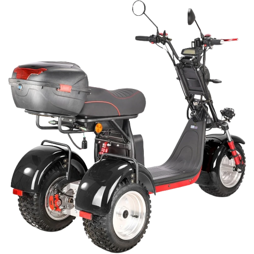 Трехколесный вариант электроскутера оснащен большими устойчивыми колесами, широким мягким сиденьем и вместительной кофрой. Техника оснащена всем необходимым для активного время провождения, поездки на рыбалку или другой вид отдыха.