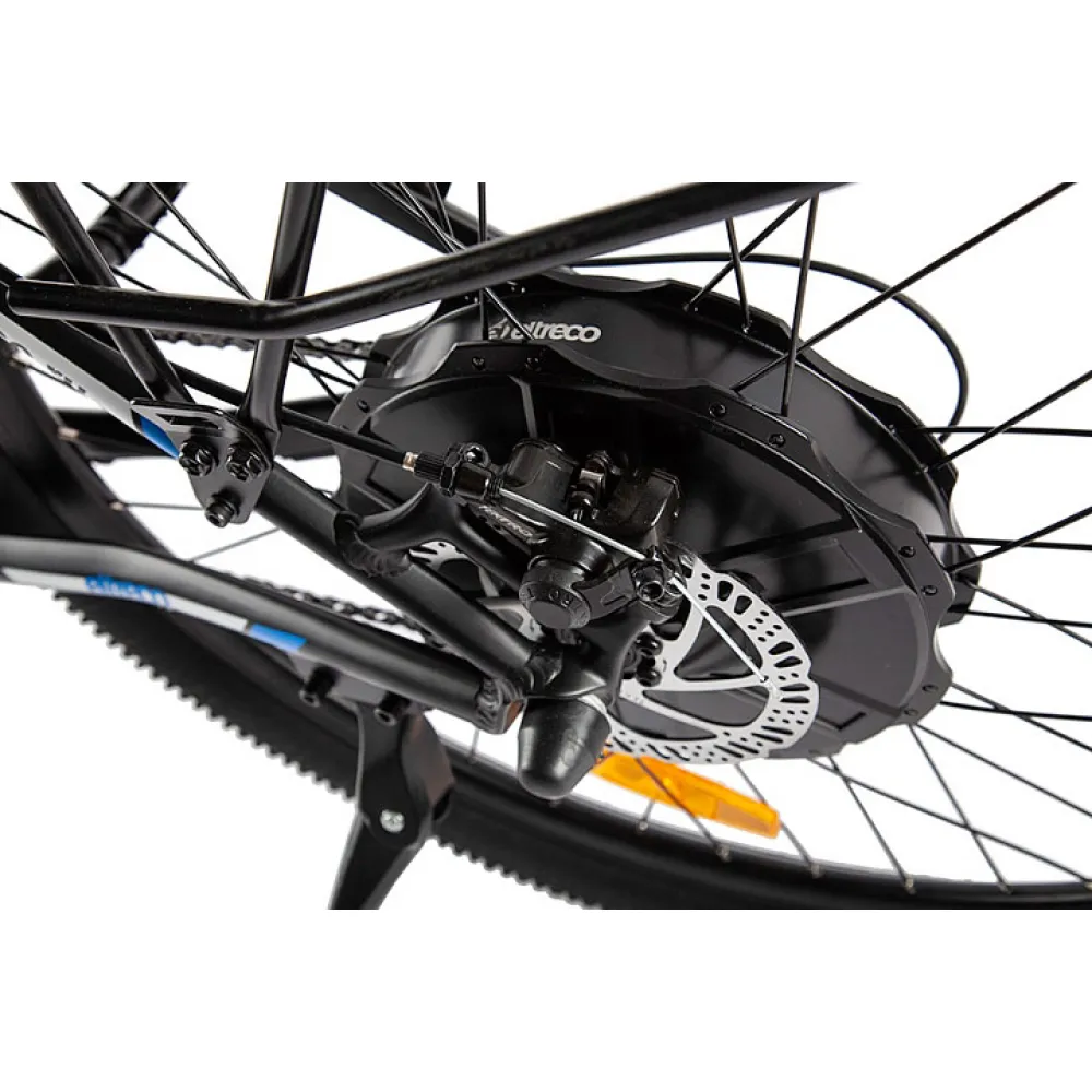 Велогибрид Eltreco XT880D - обновлённая модель от надежного российского производителя, в которой качество исполнения сочетается с комфортом эксплуатации. Электровелосипед создан для езды как по городским улицам, так и по горным и грунтовым дорогам. Мощный двигатель прямого привода обеспечивает плавный разгон до максимально допустимой отметки 35 км/час. Питает двигатель емкий литий-ионный аккумулятор, на полном заряде которого велогибрид способен преодолеть до 70 километров.  Аккумулятор расположен под рамой и легко снимается для более удобной подзарядки. Большие 27,5-дюймовые колёса и амортизатор обеспечивают мягкий и плавный ход при движении даже по неровной поверхности. Для комфортной поездки все детали электровелосипеда продуманы до мелочей. Улучшенное седло эргономичной формы обеспечивает удобную посадку, а прорезиненные ручки руля исключают соскальзывание рук во время совершения любых маневров. Благодаря складной металлической подножке велогибрид легко припарковать в любом удобном месте, даже если рядом нет никакой опоры. Велогибрид Eltreco XT880D оснащён крупным ЖК-дисплеем, с помощью которого райдер может отслеживать показатели скорости, пройденного расстояния и уровня заряда батареи.